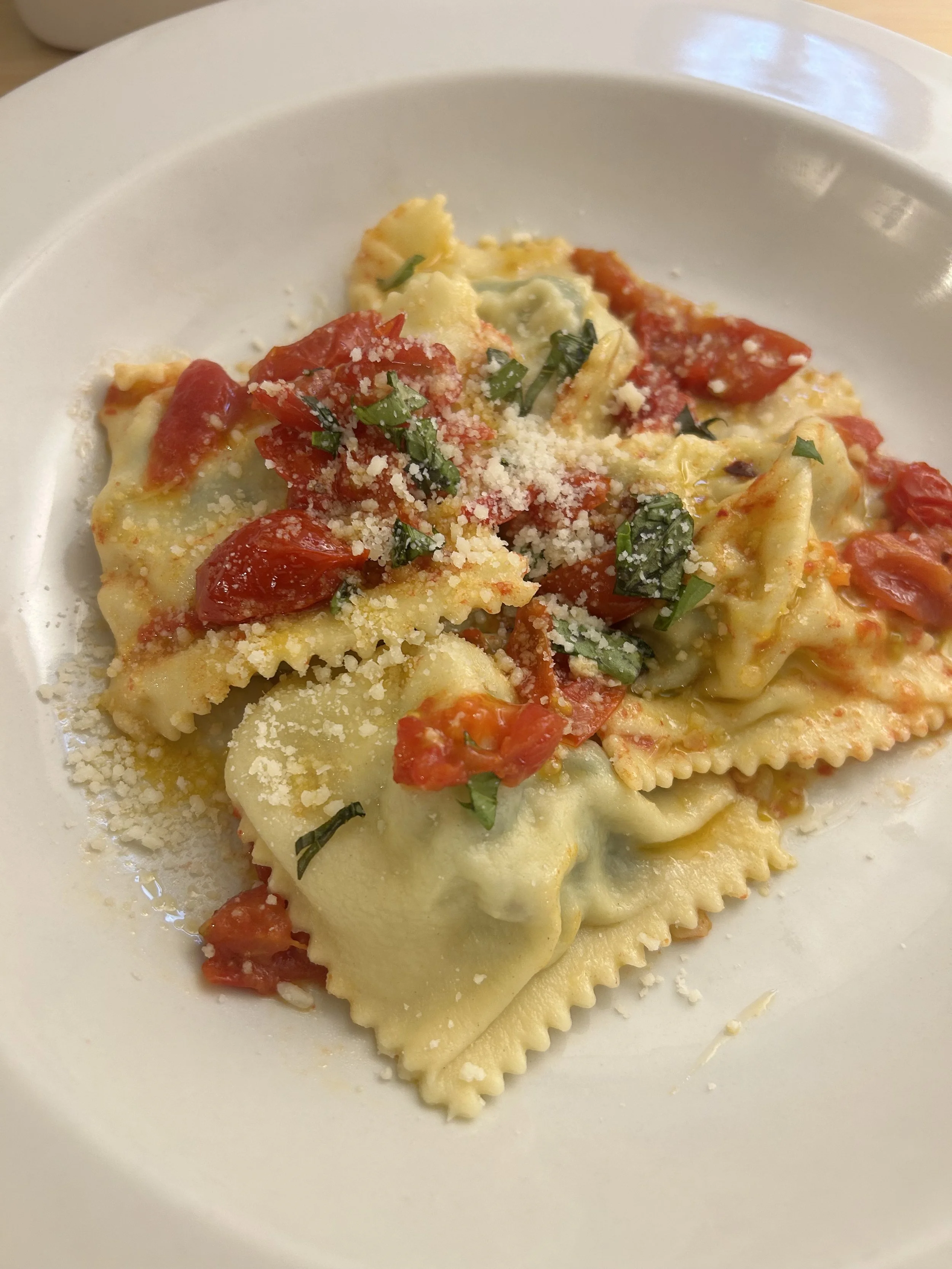 Delectable spinach, artichoke, asiago, parmesan ravioli. Topped with a simple olive oil, garlic and tomato sauce