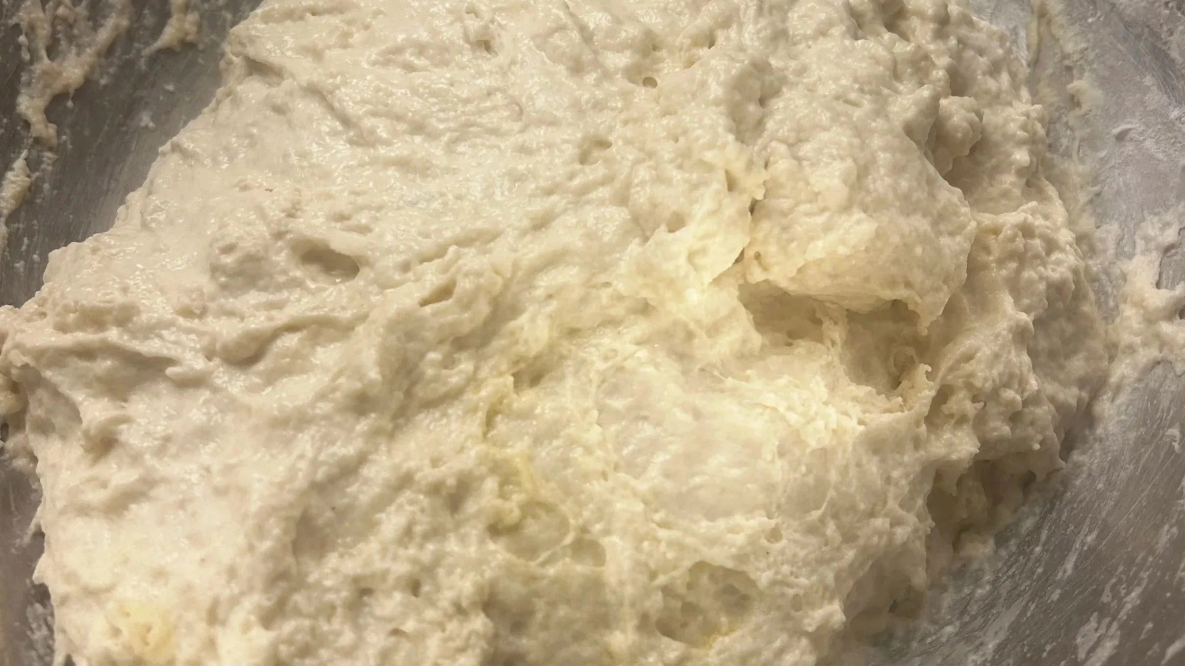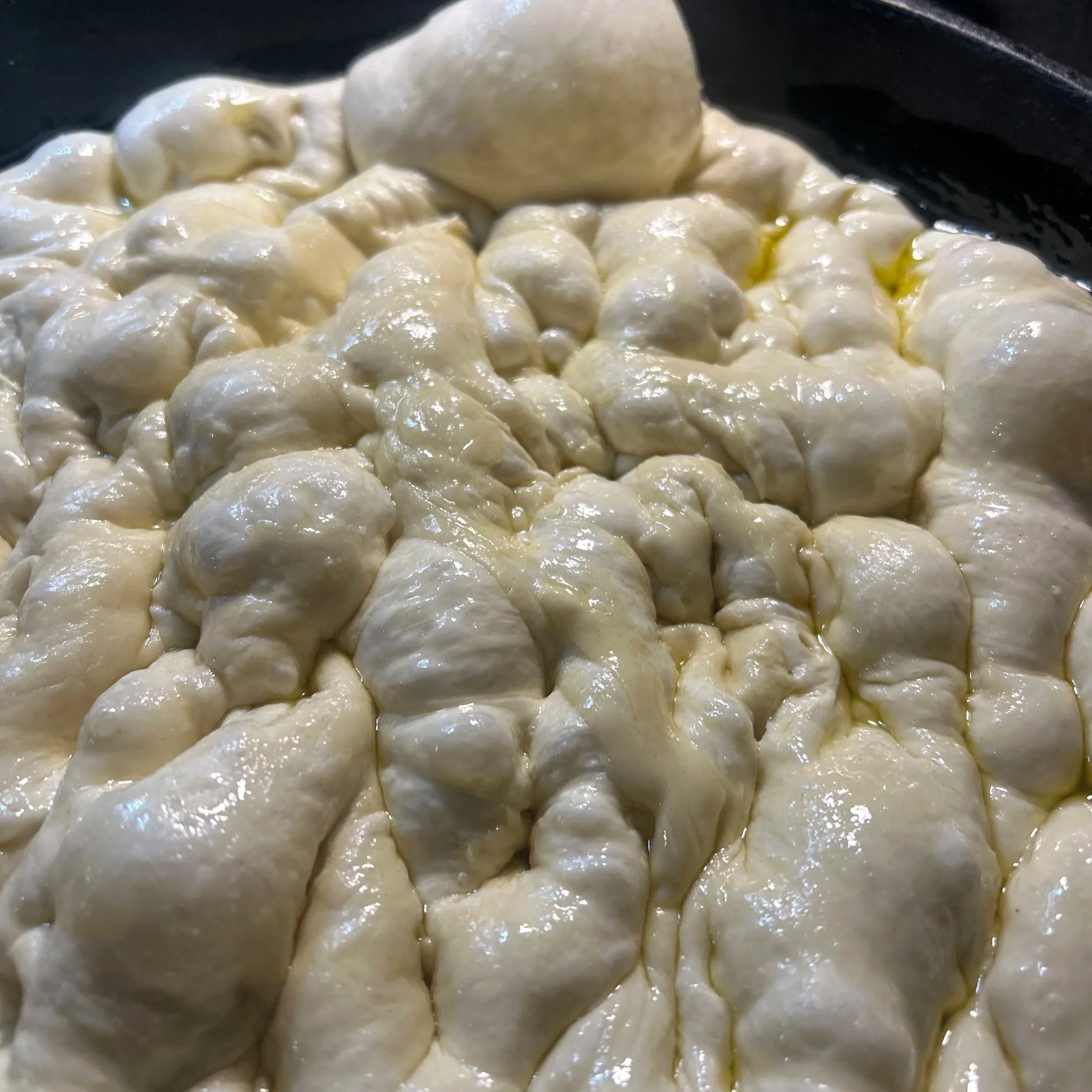 6 Drizzle with olive oil, cover, and let rise at room temperature for 4+ hours until very airy and jiggly.